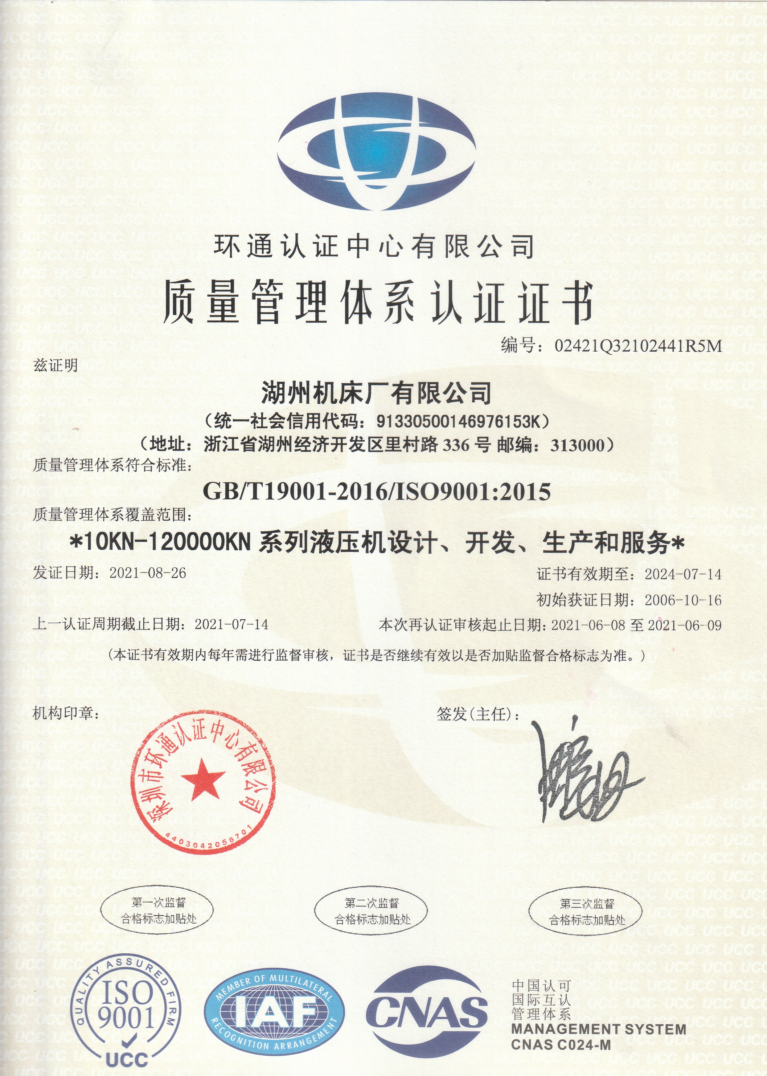 公司通過ISO9001質量體系認證,所屬液壓機研究所為浙江省省級高新技術產品研發中心,并長期與浙江大學、上海交通大學等著名院校合作聯合開發新產品、新技術。公司現具備 10?200000KN各類大型、數控、專用、精密及成套液壓機的研發、制造能力。公司經過五十多年發展,目前已形成四柱式、框架式、單柱式、臥式等多種結構形式的液壓機,產品包括通用液 壓機、金屬板材成形液壓機、金屬體積成形液壓機、管件壓制成形液壓機、粉末制品壓制液壓機、橡塑制品壓制液壓機、電機制造專用液壓機、車輪制造專用液壓機、特種壓制成形液壓機、 高強度鋼板熱沖成形液壓機、內高壓成形液壓機、汽車縱梁壓制液壓機、數控伺服液壓機、精沖液壓機、復合材料(SMC)模壓成形液壓機、炭素擠壓液壓機、車門包邊液壓機、重型鋼結構 件校正成形液壓機、玻璃器皿成形液壓機等五十余個系列四百多個品種,多項產品獲部、省優 稱號,多項產品入選國家重點新產品和省裝備制造業重點領域首臺(套)產品,并擁有授權專利100余項,為浙江省專利示范型企業。