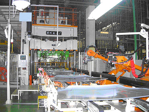 車門包邊液壓機是為汽車制造廠開發的專用液壓機,具有速度快、自動化程度高、工作柔性化程度高等特點,廣泛應用于汽車車門的包邊工藝。本系列液壓機由主機和快速換模系統組成,快速換模系統采用具有自主知識產權的移動工作臺模具置換裝置,包括多只移動工作臺的組合、換模小車、儲模系統和模具快速夾緊系統、控制系統